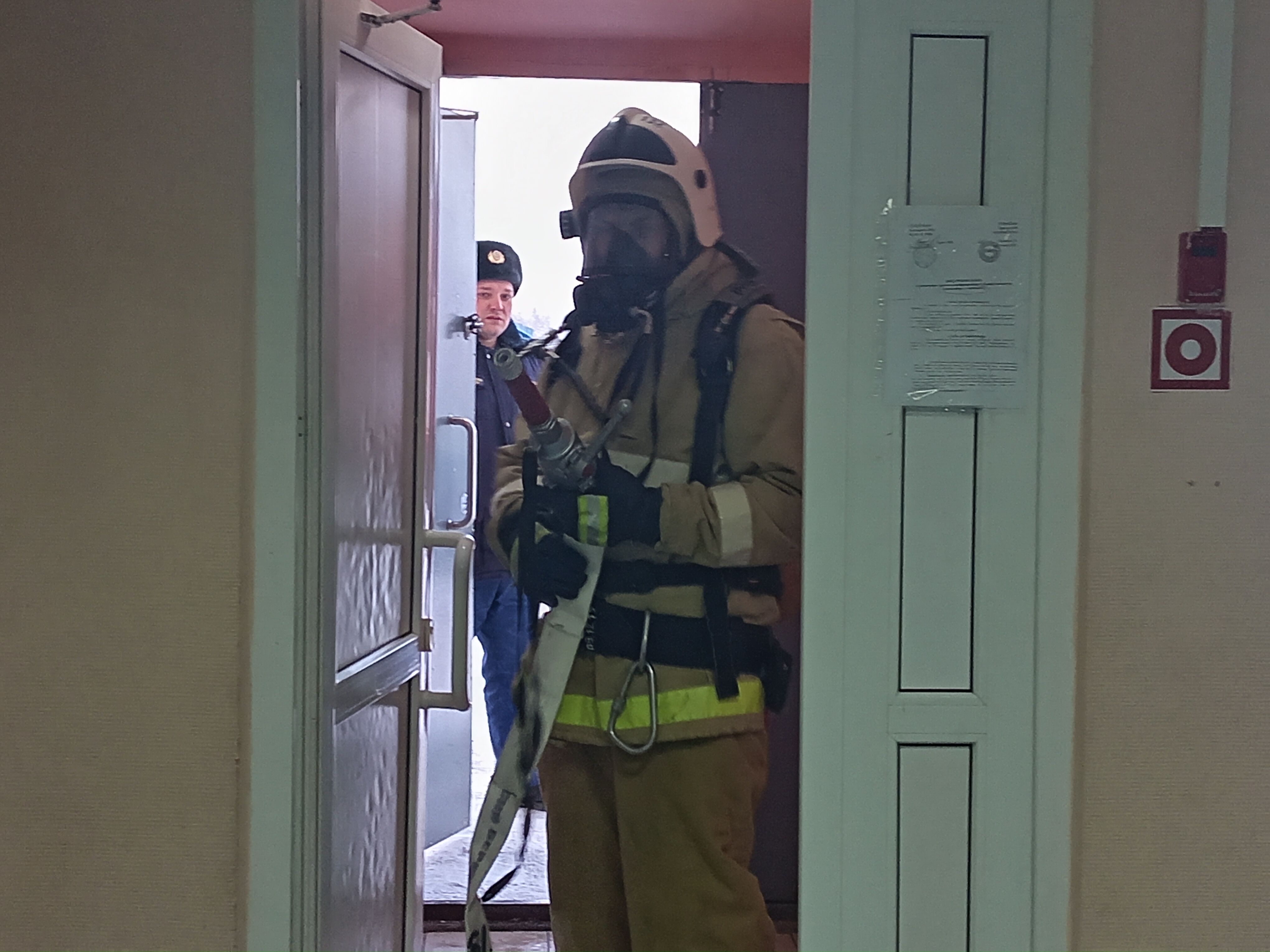 По легенде учений, возгорание произошло на первом этаже двухэтажного здания в учебном классе.