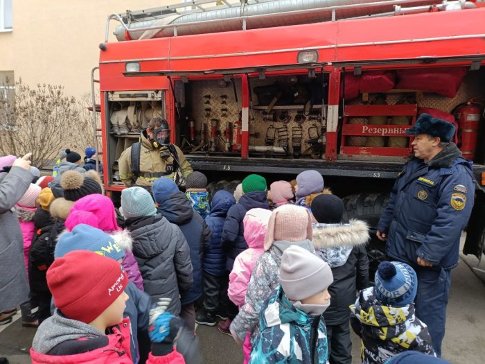 Дети с интересом изучали пожарную технику и даже смогли примерить пожарную каску.