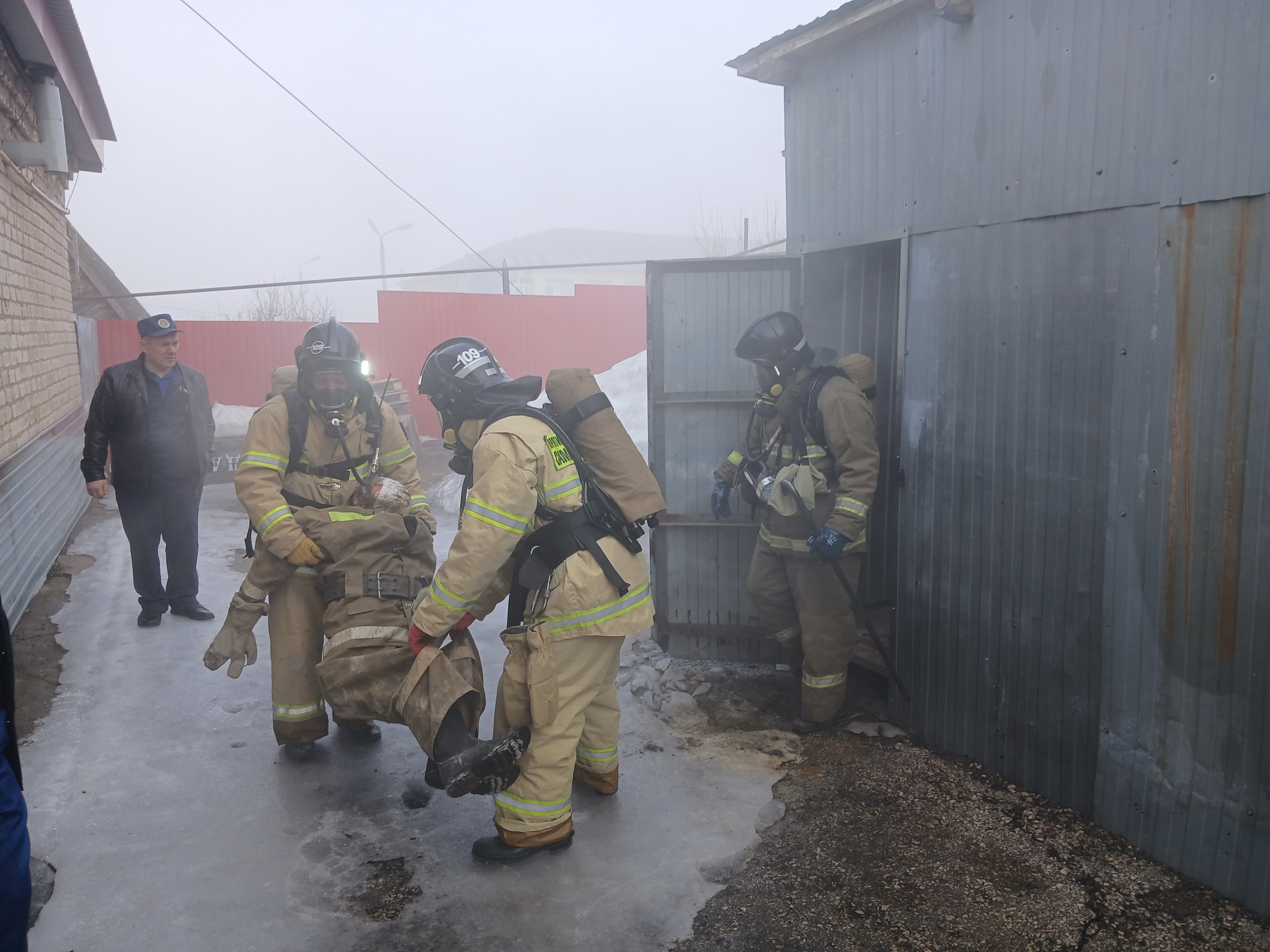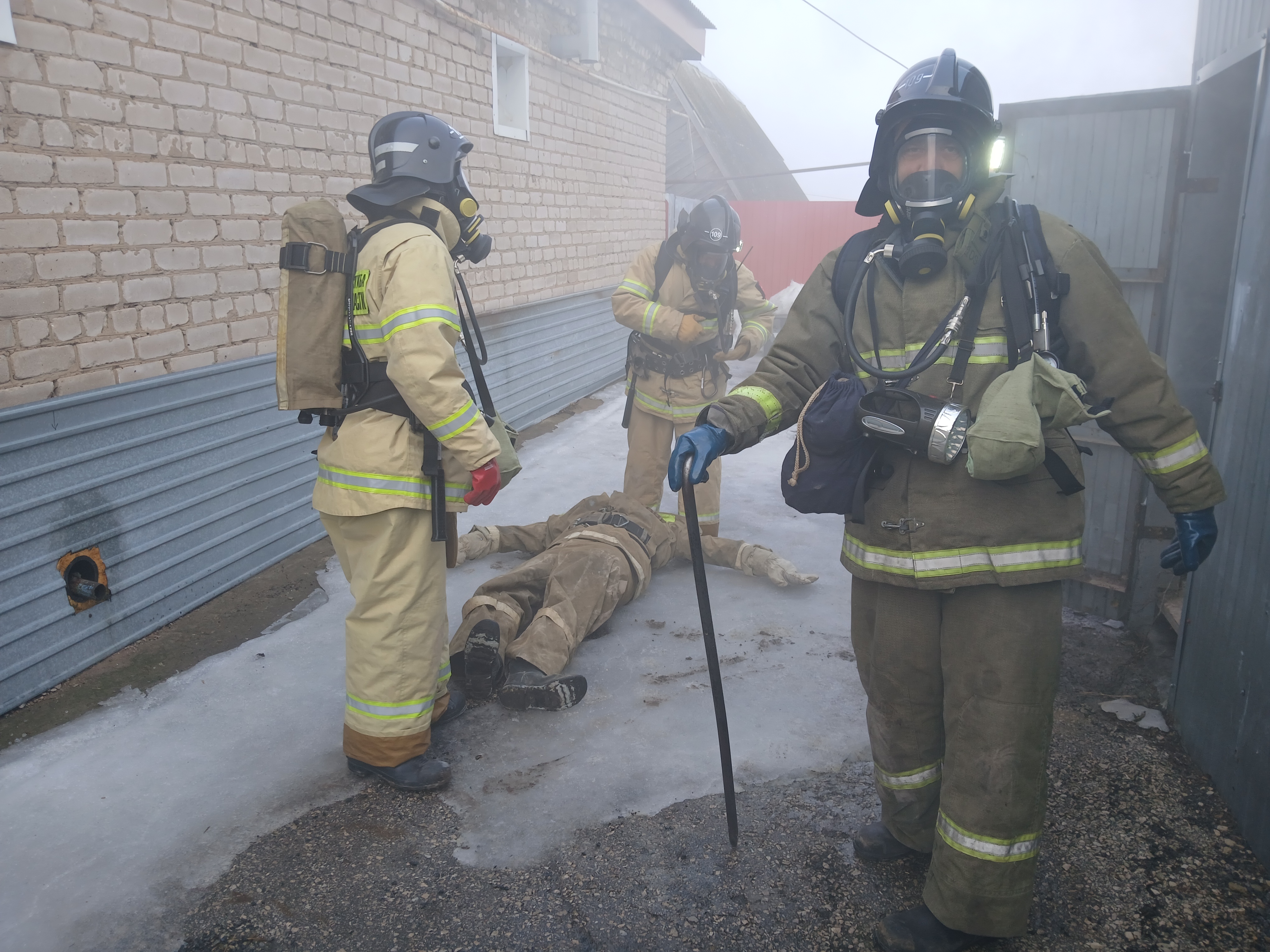 В рамках занятий огнеборцы отрабатывали элементы тушения очага условного пожара.