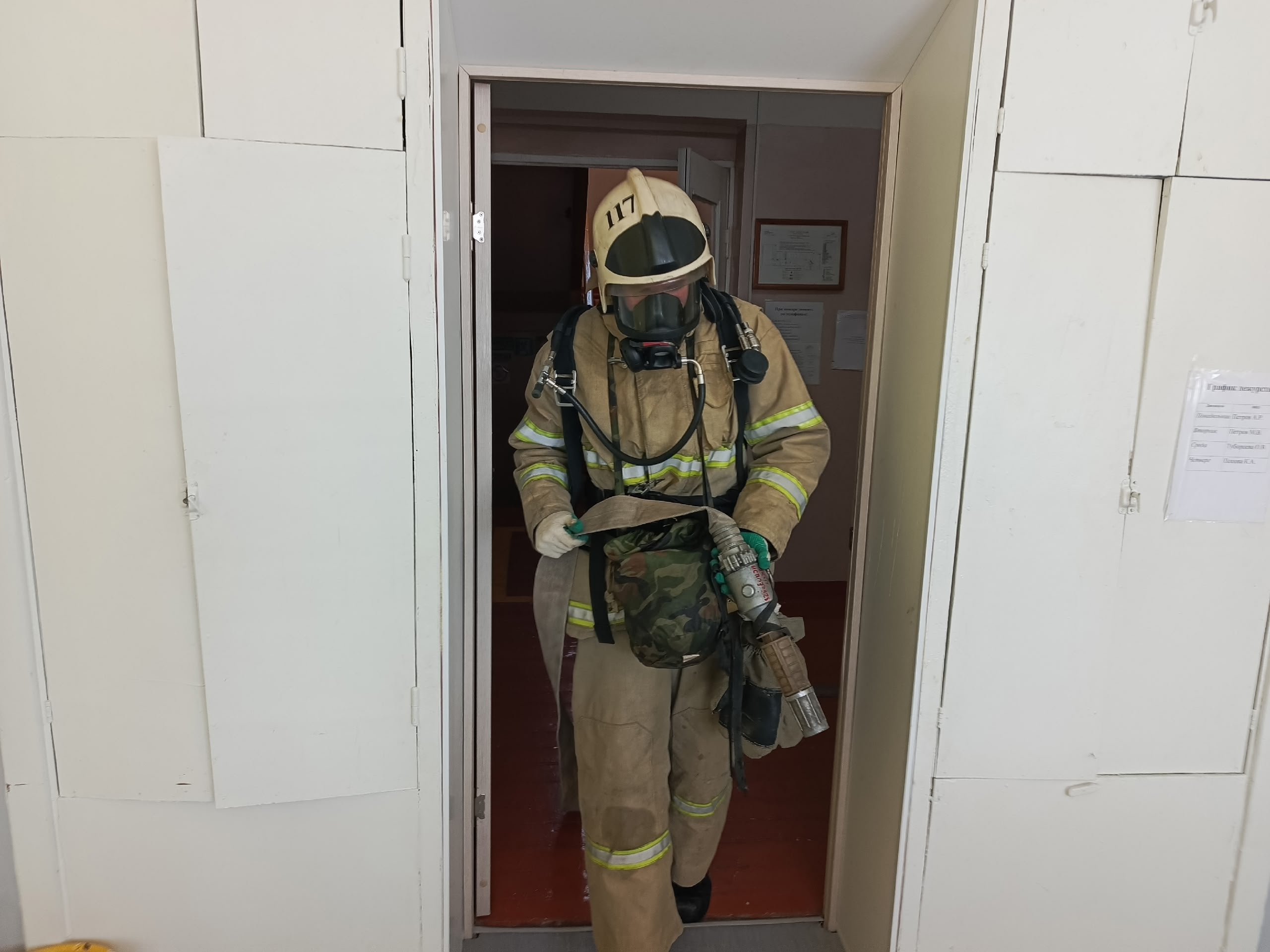 В ходе учения пожарные‑спасатели отработали оперативное боевое развертывание сил и средств после прибытия на место происшествия, поиск и спасение людей внутри здания, прокладку рукавных линий для подачи огнетушащих веществ и тушения условного возгорания.