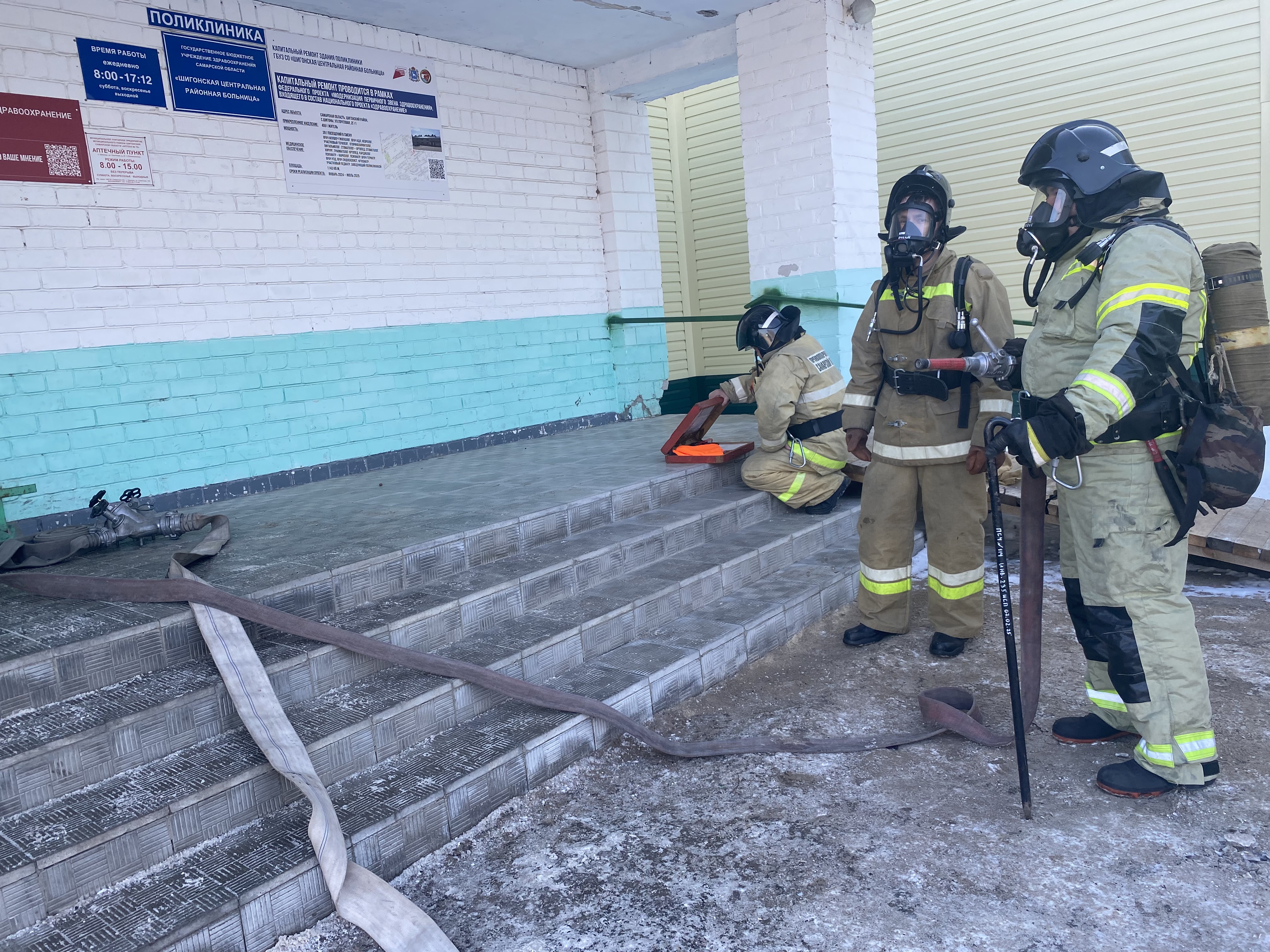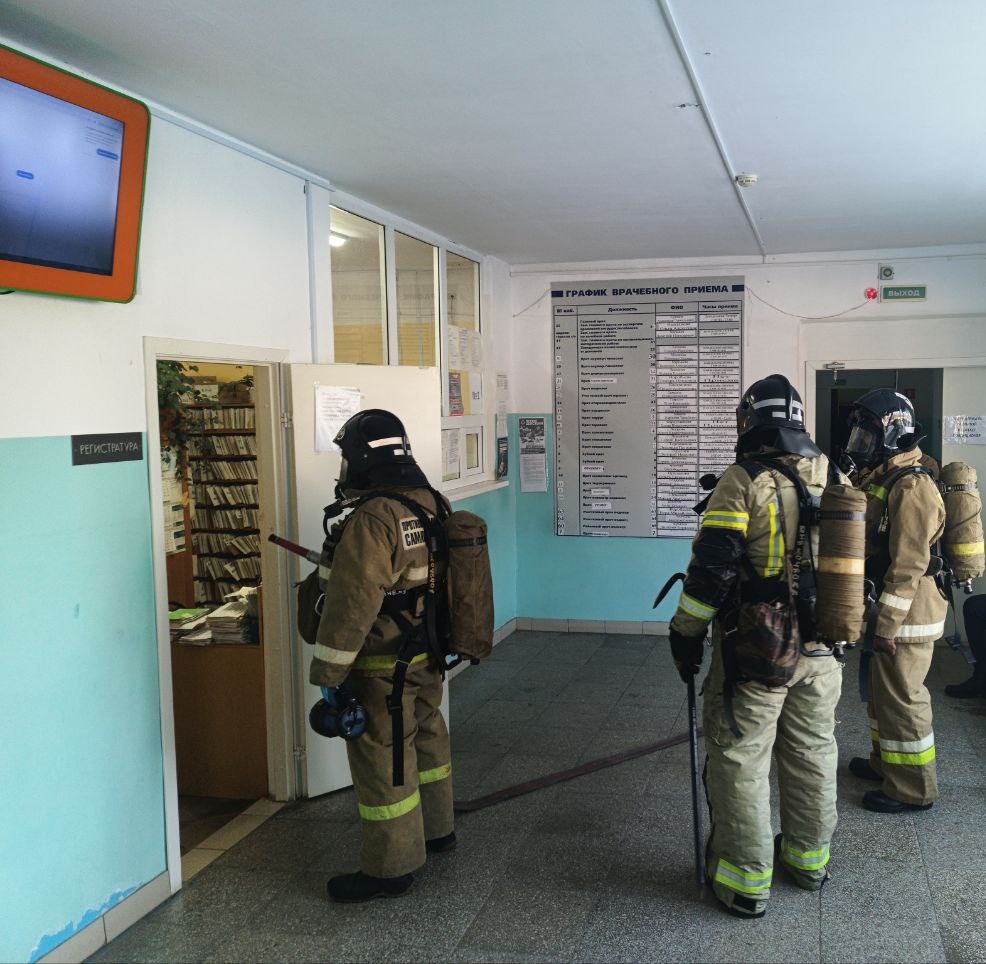 По замыслу учения, на пульт пожарной охраны поступил сигнал о возгорании в результате короткого замыкания неисправной электропроводки в регистратуре здания одной из поликлиник.
