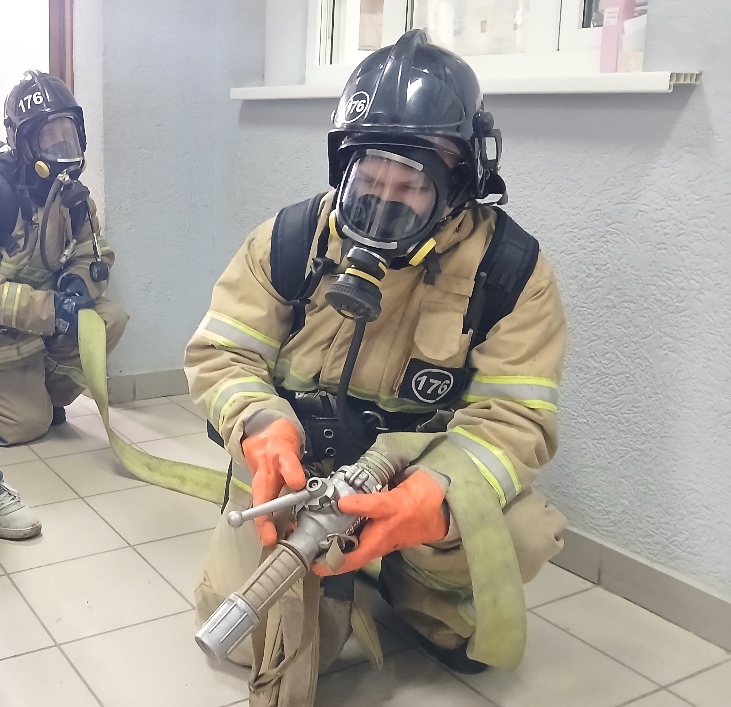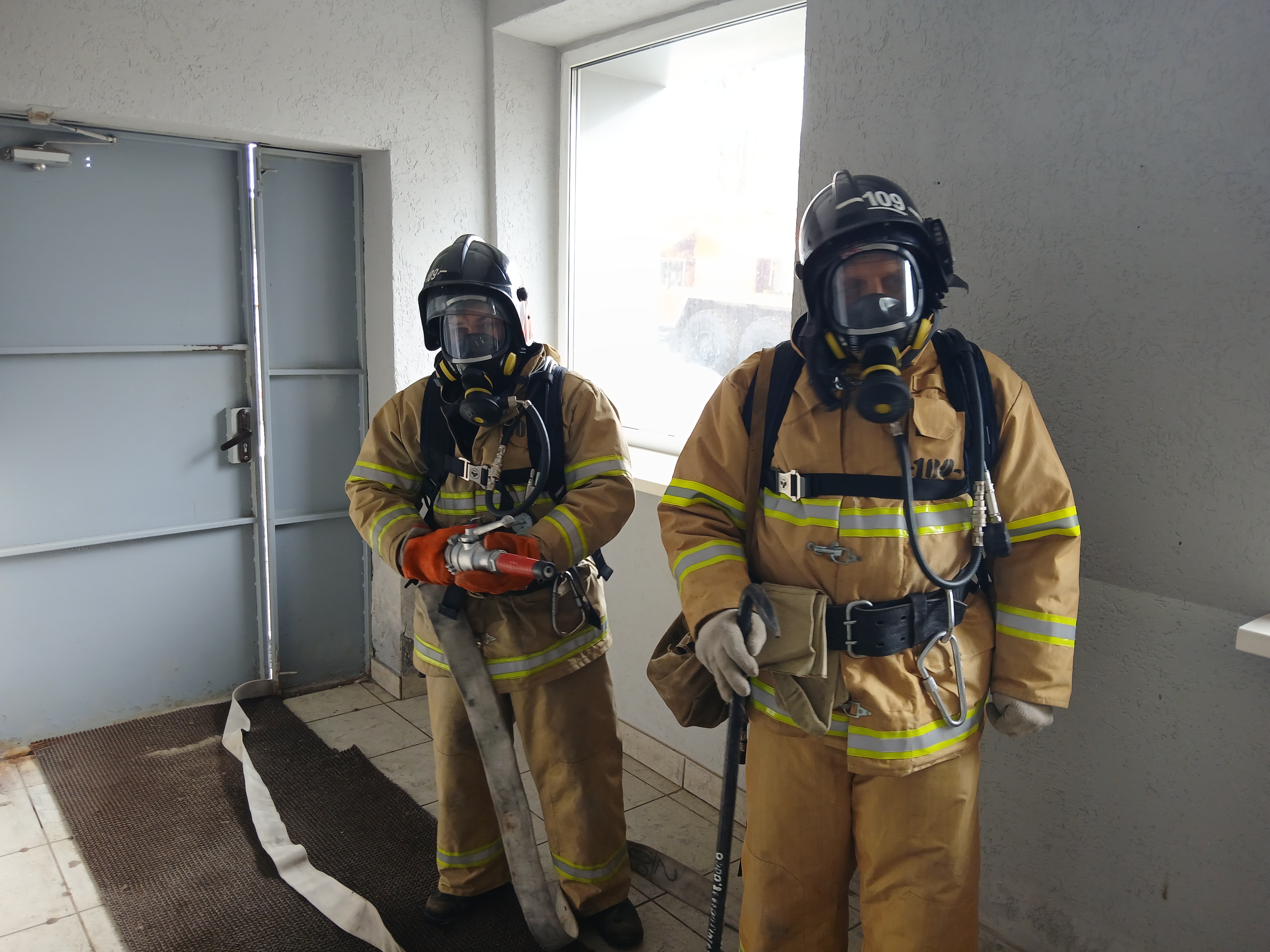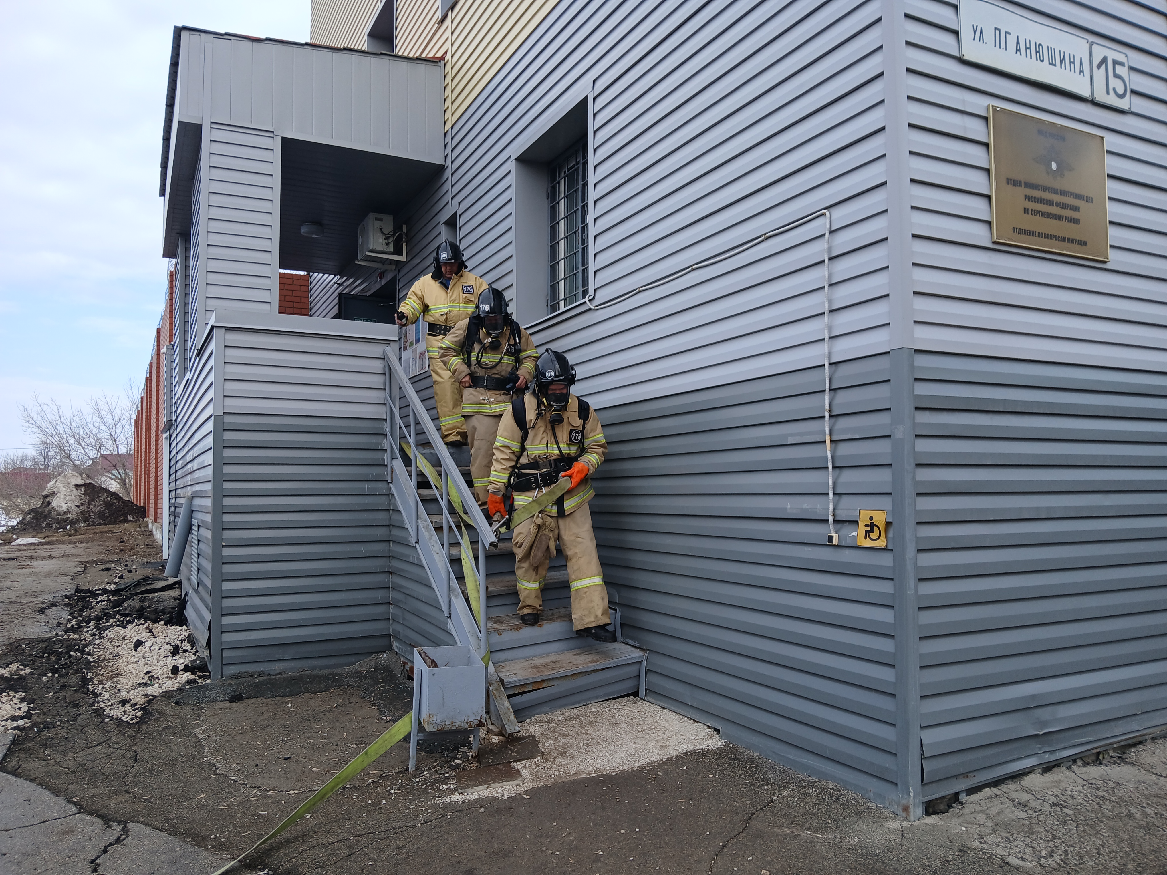 По замыслу учений на первом этаже произошло условное возгорание. Сотрудник полиции незамедлительно инициировал срабатывание автоматической пожарной сигнализации с оповещением по громкой связи и сообщил о пожаре по номеру «101». Все сотрудники полиции самостоятельно эвакуировались в установленное место из «опасного» здания.