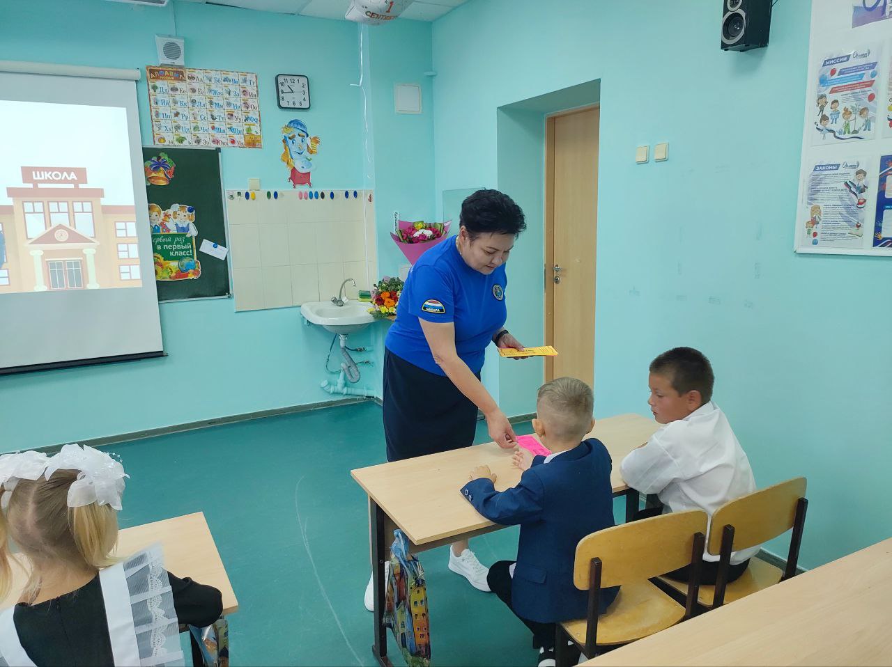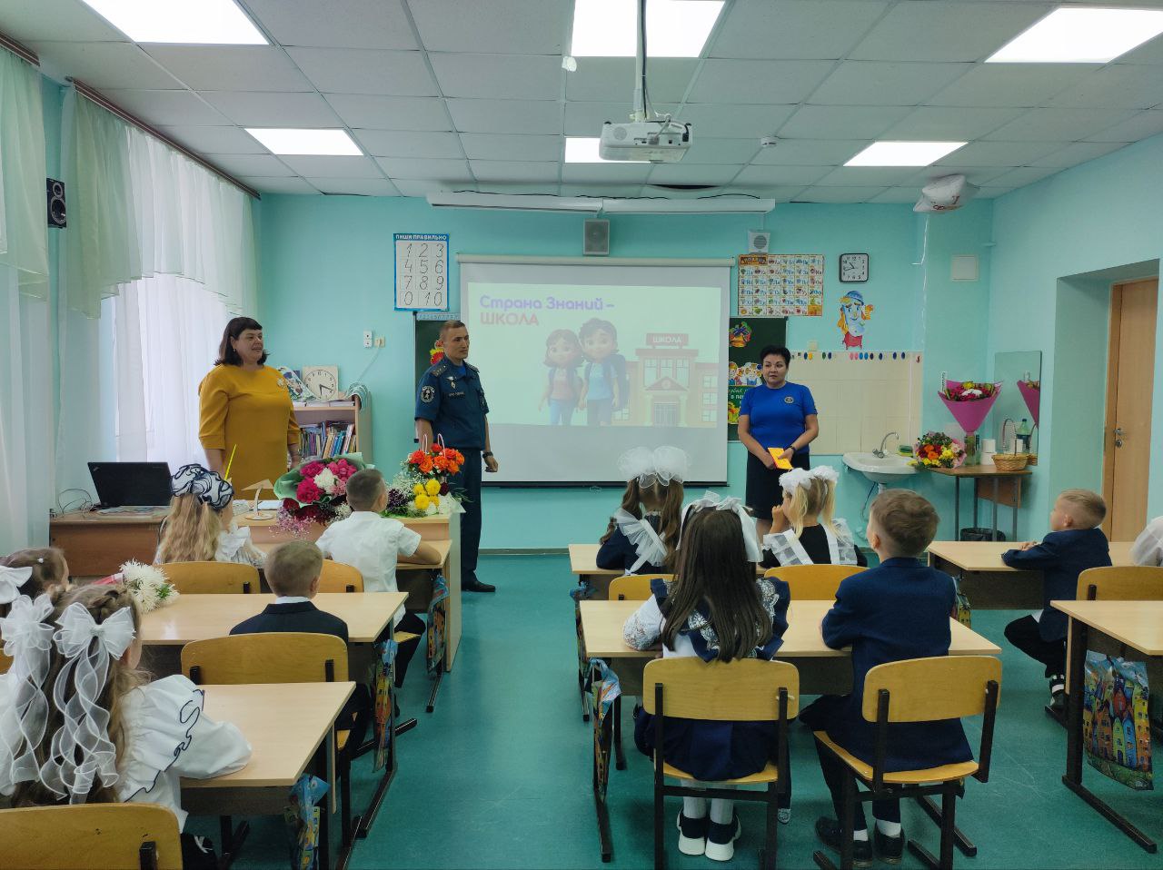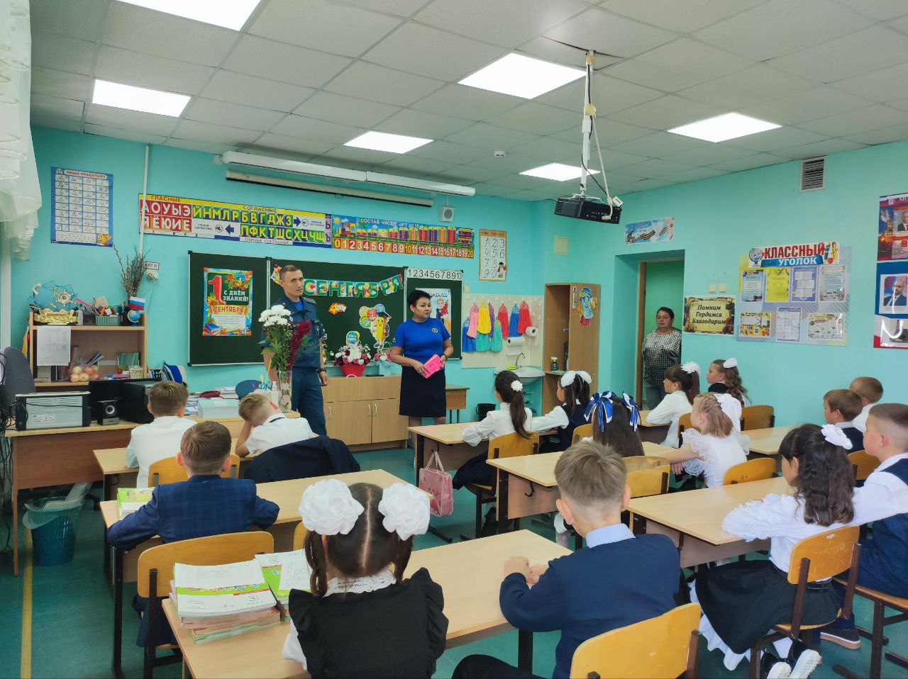 Юрий Алексеевич поздравил ребят с новым учебным годом, пожелал им больших успехов в учебе, рассказал о правилах, которые необходимо всегда соблюдать в школе, дома и на улице, чтобы не допустить пожара, напомнил номера вызова экстренных служб.