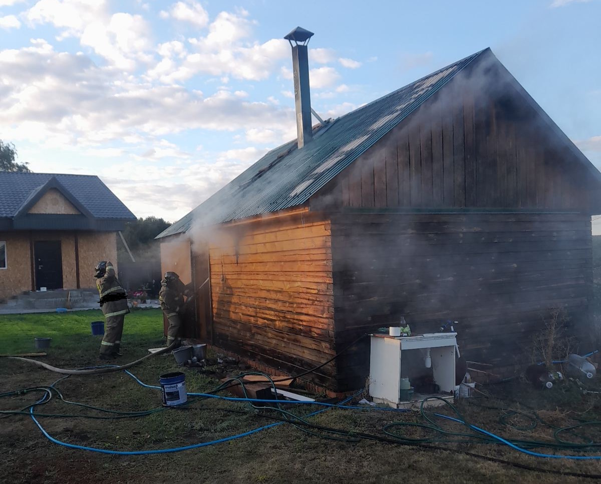 По прибытии на место пожара было установлено, что горит частная баня, существует угроза распространения огня на соседние строения.