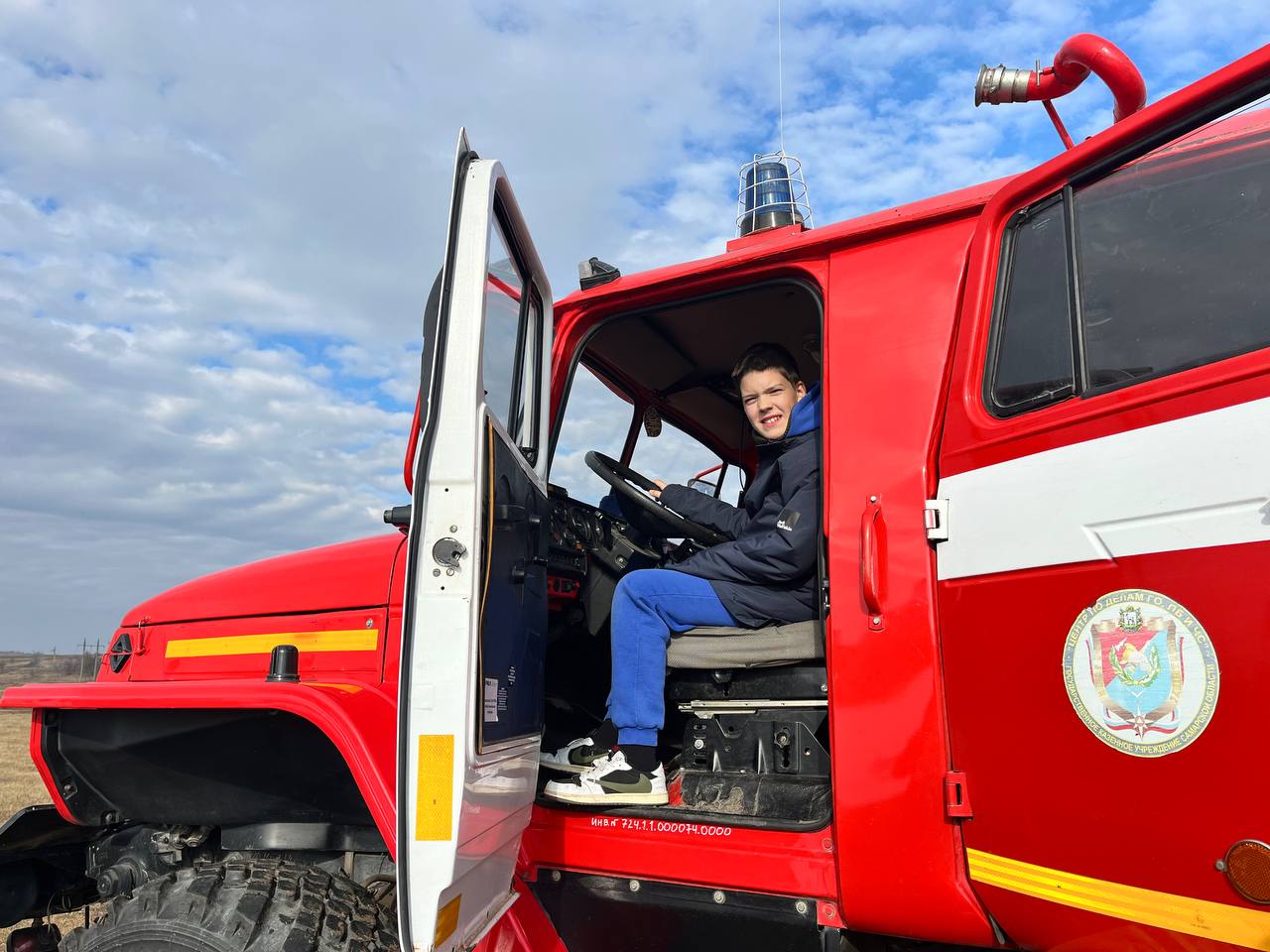 Ребята с удовольствием примеряли элементы боевой одежды, а также смогли посидеть за рулем пожарной машины.