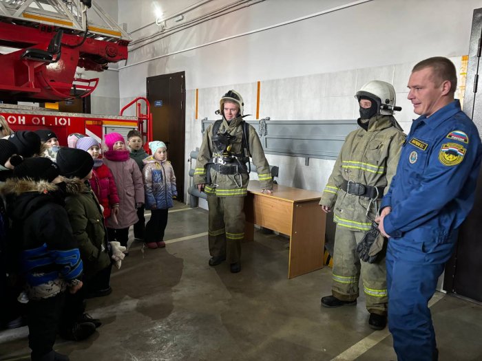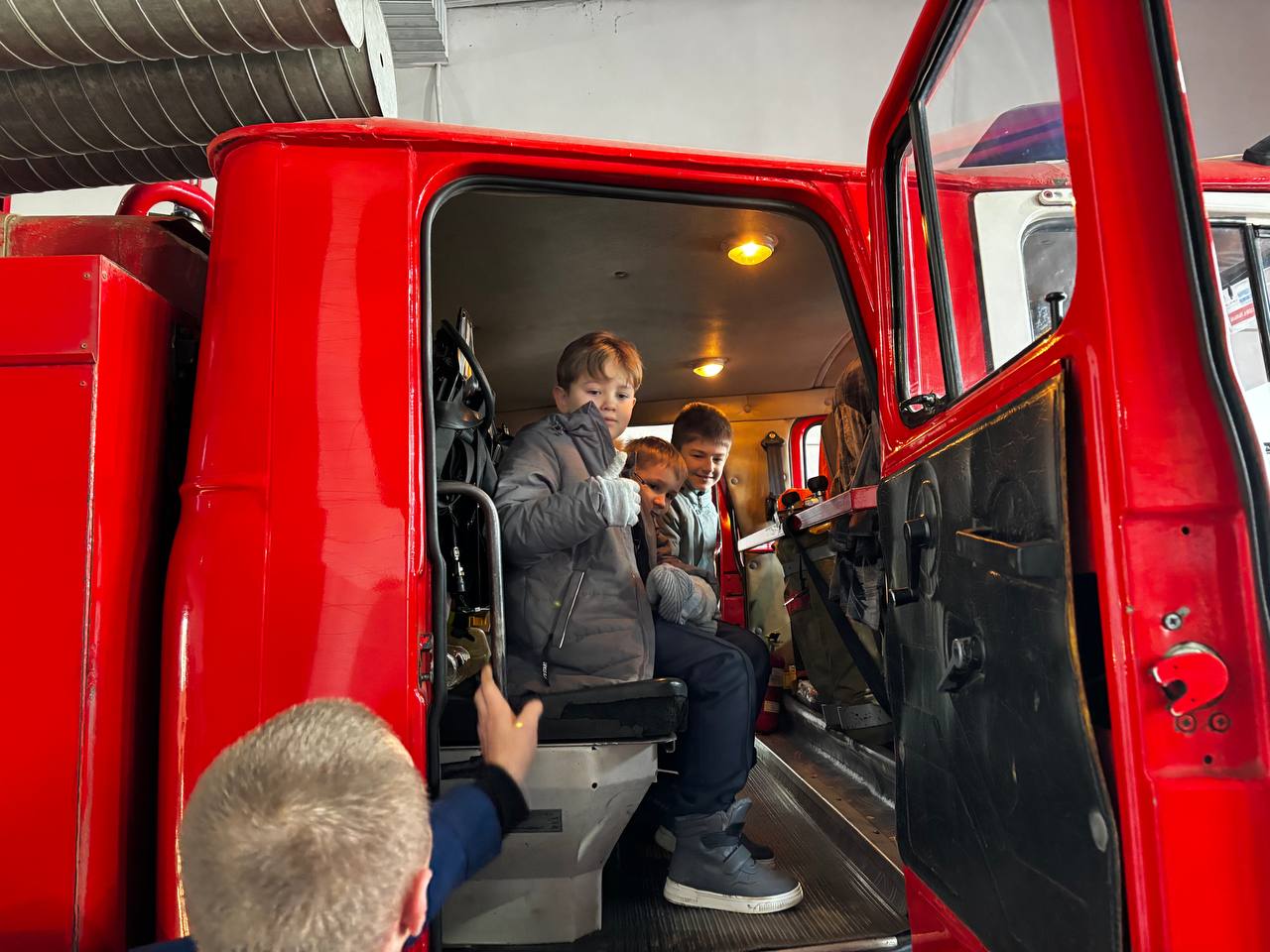 Командир отделения Михаил Марков встретил юных гостей и провел увлекательную экскурсию по пожарной части: показал ребятне учебный класс, диспетчерский пункт, гараж боевых машин. Особой радостью для детей стало знакомство с пожарной техникой, ведь им не просто рассказали, как устроены машины и для чего нужно каждое устройство, а подарили шанс почувствовать себя настоящими отважными огнеборцами: сначала зажгли проблесковые маячки автоцистерны, затем разрешили заглянуть в кабину пожарного автомобиля — дети с интересом изучали её устройство. А в завершение каждый смог примерить каску пожарного и средства индивидуальной защиты.
