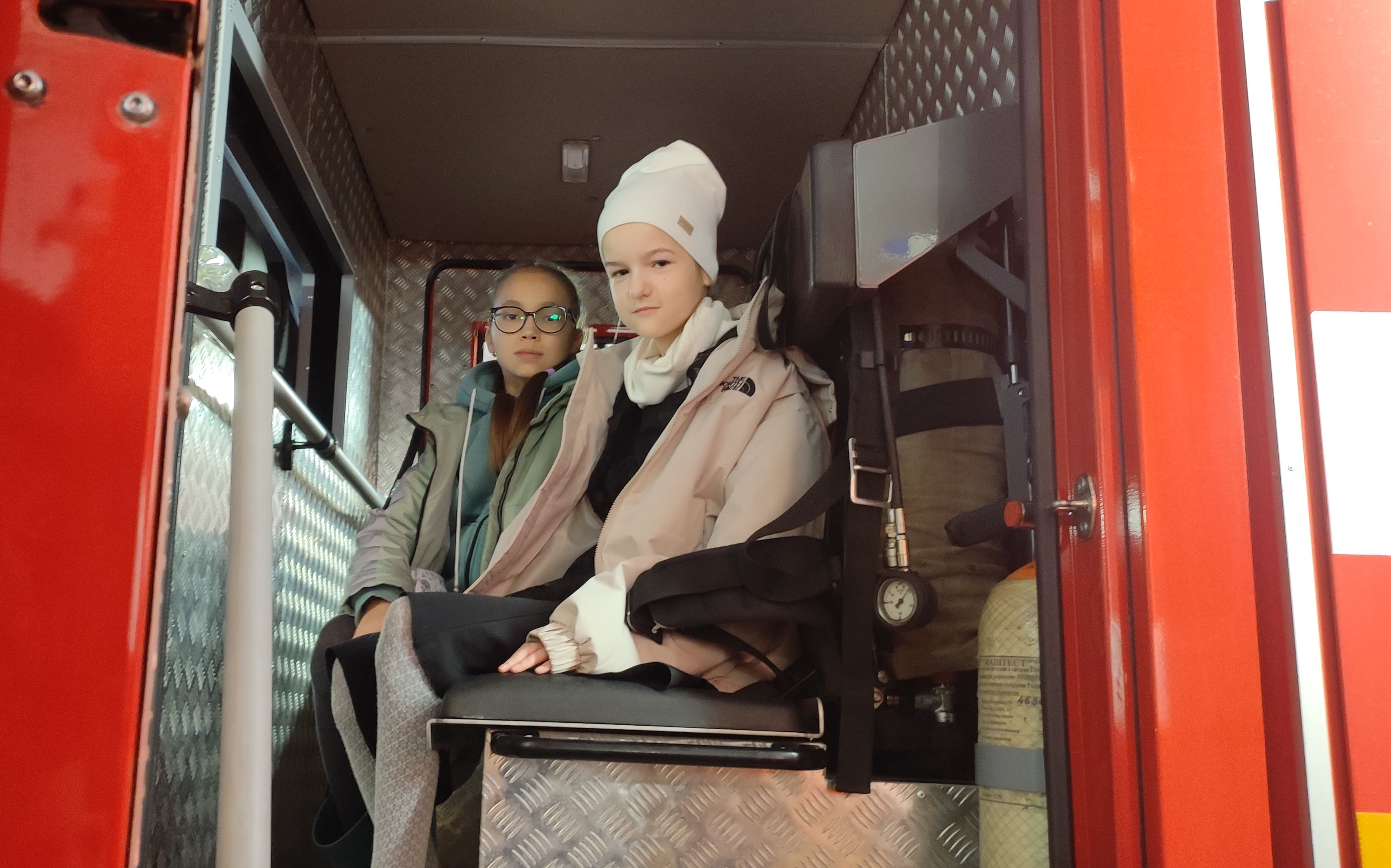 Школьники внимательно рассматривали экипировку пожарных, смогли посидеть в пожарных автомобилях.