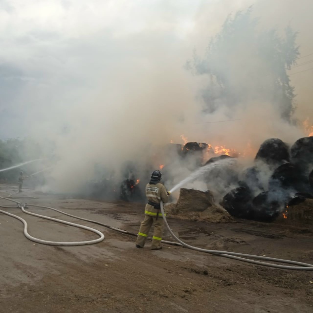 По прибытии было установлено, что на площади 45 квадратных метров горит 600 тонн тюкованного сена.